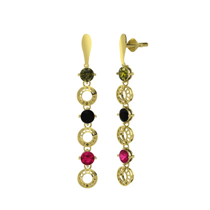 Peridot, siyah zirkon ve rodolit garnet 925 ayar altın kaplama gümüş küpe