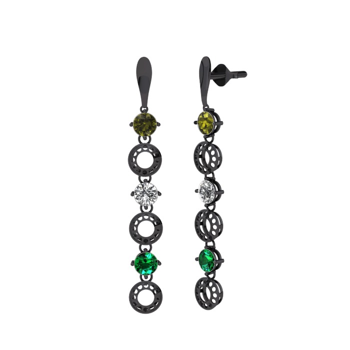 Peridot, swarovski ve yeşil kuvars 925 ayar siyah rodyum kaplama gümüş küpe