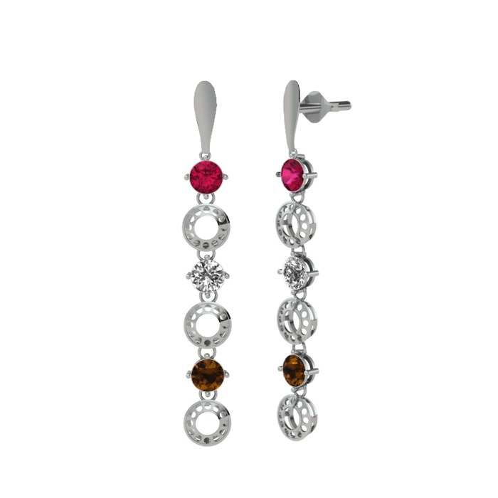 Rodolit garnet, beyaz zirkon ve dumanlı kuvars 14 ayar beyaz altın küpe