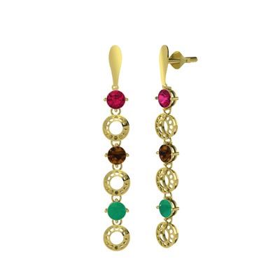 Rodolit garnet, dumanlı kuvars ve kök zümrüt 14 ayar altın küpe