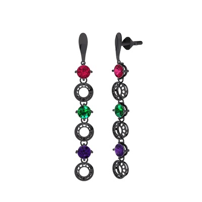 Rodolit garnet, yeşil kuvars ve ametist 925 ayar siyah rodyum kaplama gümüş küpe