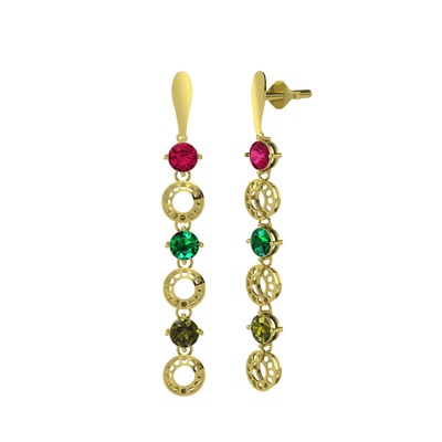 Rodolit garnet, yeşil kuvars ve peridot 18 ayar altın küpe