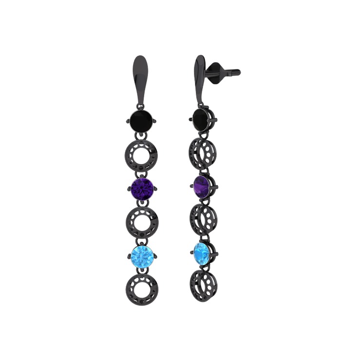 Siyah zirkon, ametist ve akuamarin 925 ayar siyah rodyum kaplama gümüş küpe