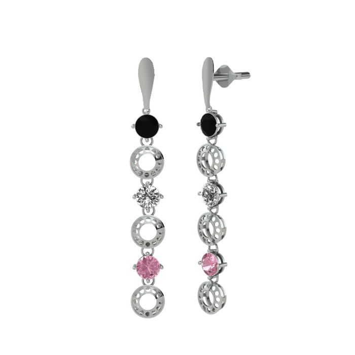 Siyah zirkon, beyaz zirkon ve pembe kuvars 14 ayar beyaz altın küpe