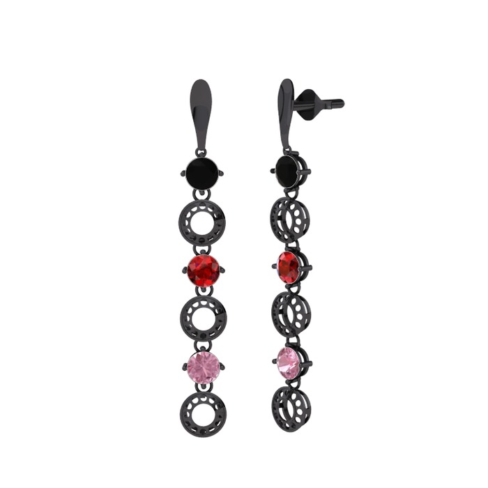 Siyah zirkon, garnet ve pembe kuvars 925 ayar siyah rodyum kaplama gümüş küpe