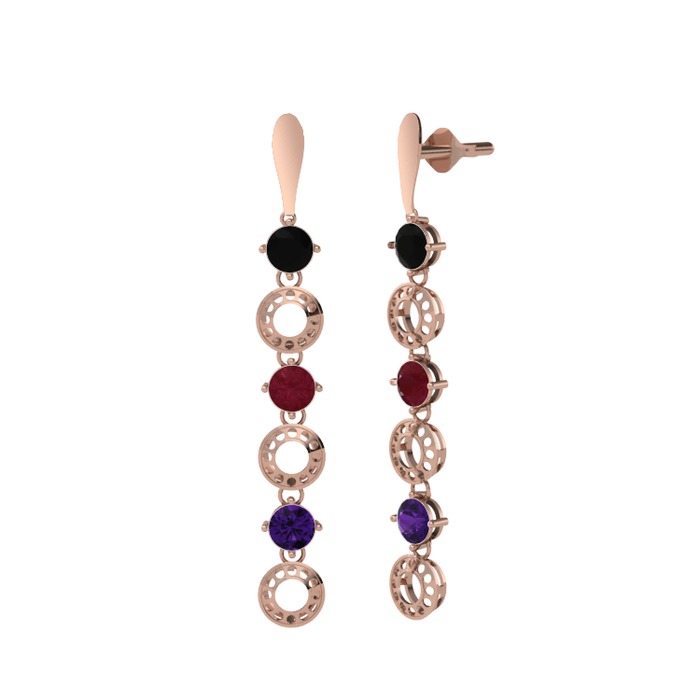 Siyah zirkon, kök yakut ve ametist 18 ayar rose altın küpe
