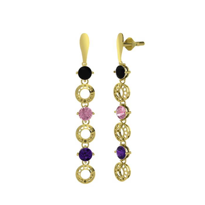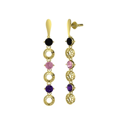 Siyah zirkon, pembe kuvars ve ametist 8 ayar altın küpe