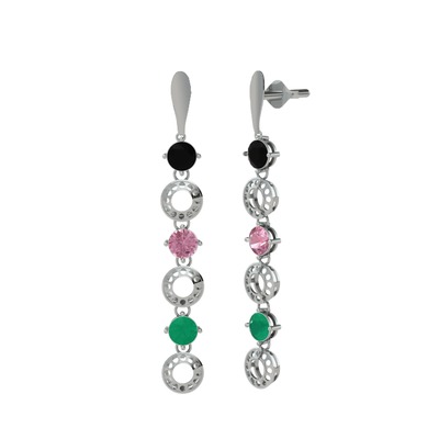 Siyah zirkon, pembe kuvars ve kök zümrüt 18 ayar beyaz altın küpe