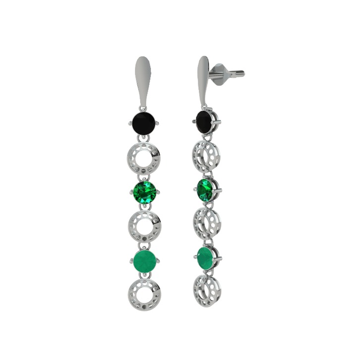 Siyah zirkon, yeşil kuvars ve kök zümrüt 18 ayar beyaz altın küpe