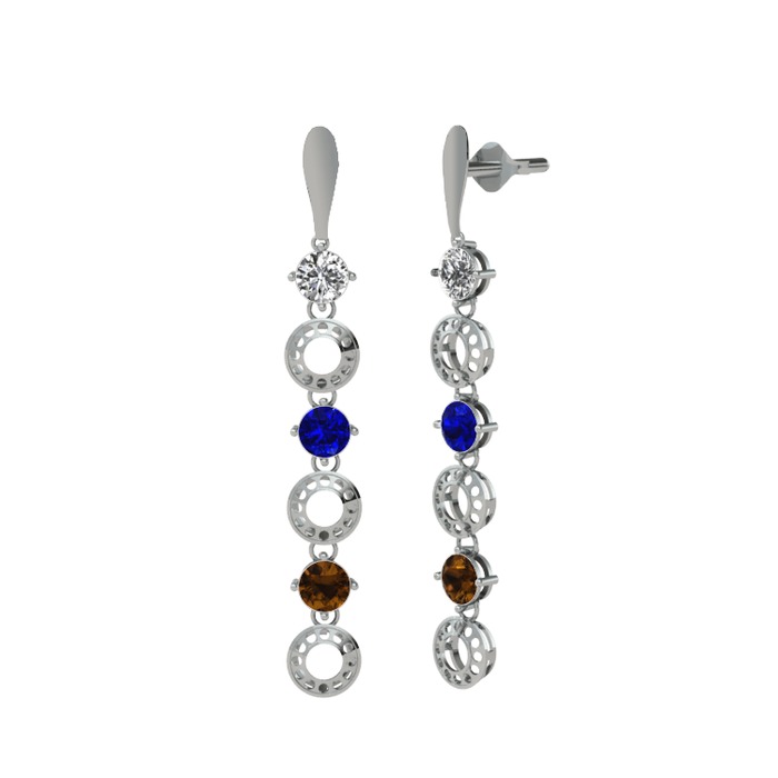 Swarovski, lab safir ve dumanlı kuvars 14 ayar beyaz altın küpe