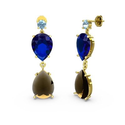 Akuamarin, dumanlı kuvars ve lab safir 14 ayar altın küpe