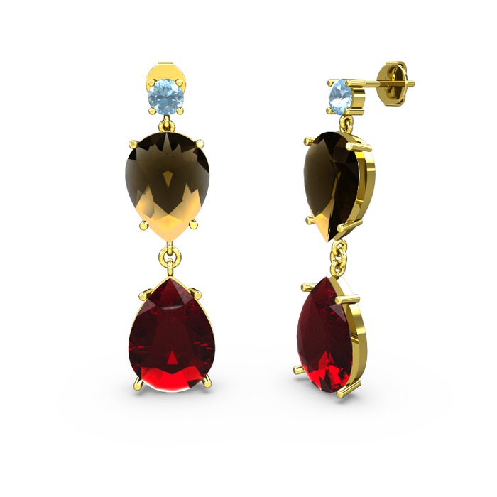 Akuamarin, garnet ve dumanlı kuvars 8 ayar altın küpe
