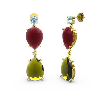 Akuamarin, peridot ve kök yakut 14 ayar altın küpe