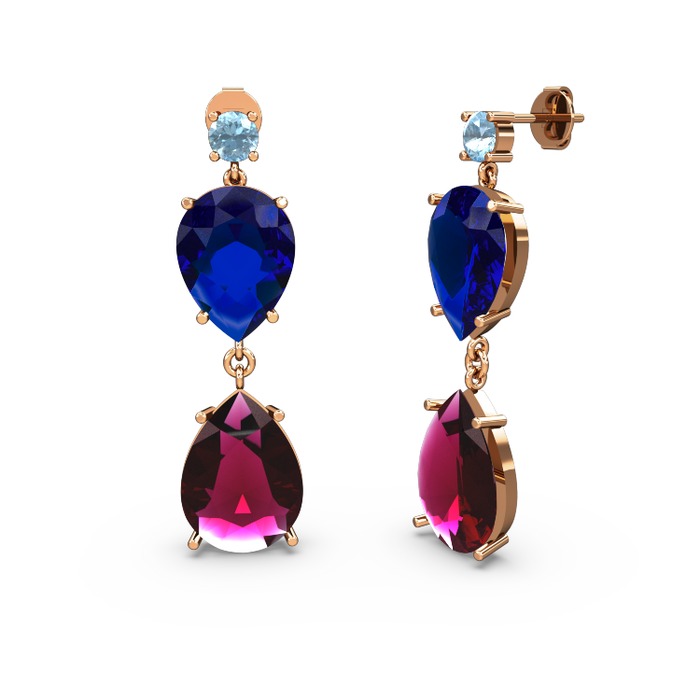 Akuamarin, rodolit garnet ve lab safir 8 ayar rose altın küpe