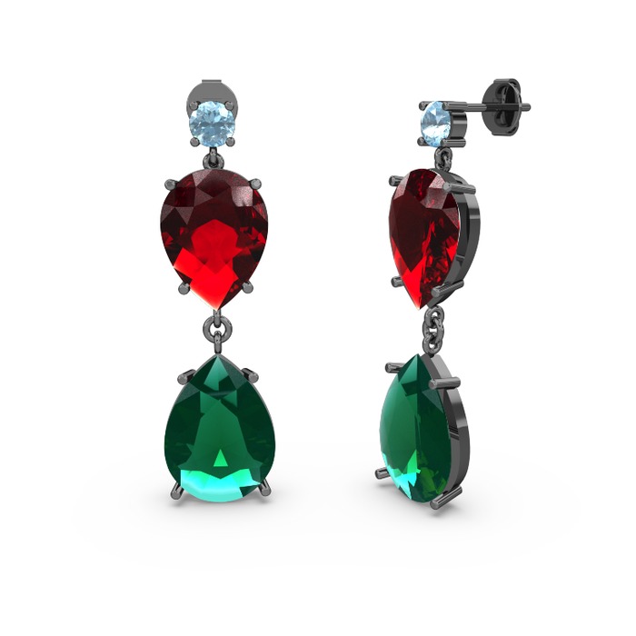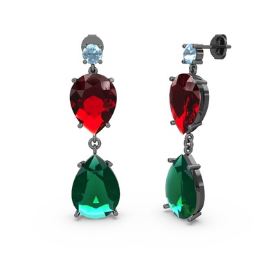Akuamarin, yeşil kuvars ve garnet 925 ayar siyah rodyum kaplama gümüş küpe