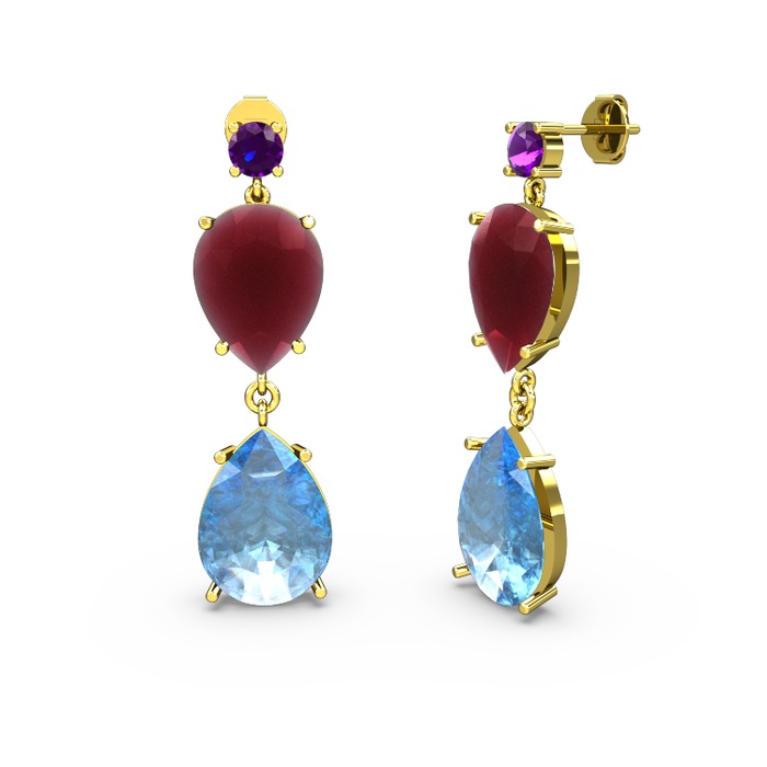 Ametist, akuamarin ve kök yakut 18 ayar altın küpe