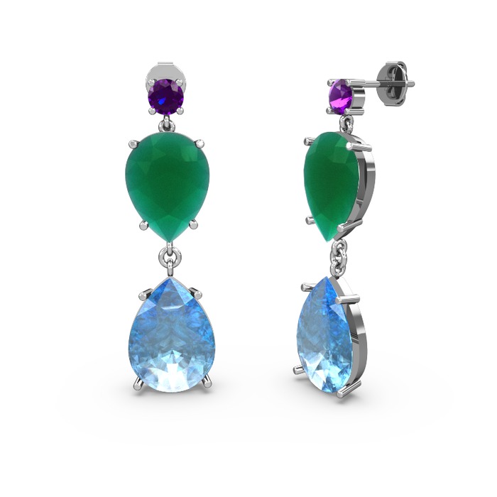 Ametist, akuamarin ve kök zümrüt 18 ayar beyaz altın küpe