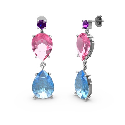 Ametist, akuamarin ve pembe kuvars 8 ayar beyaz altın küpe