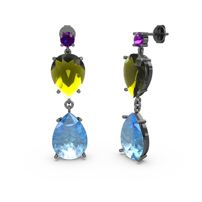 Ametist, akuamarin ve peridot 925 ayar siyah rodyum kaplama gümüş küpe
