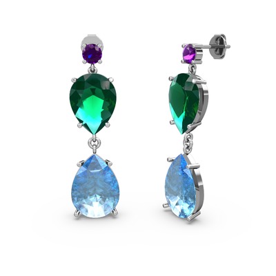 Ametist, akuamarin ve yeşil kuvars 8 ayar beyaz altın küpe