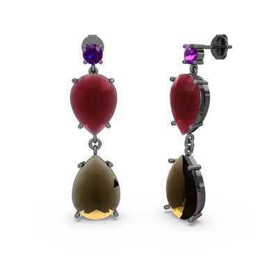 Ametist, dumanlı kuvars ve kök yakut 925 ayar siyah rodyum kaplama gümüş küpe