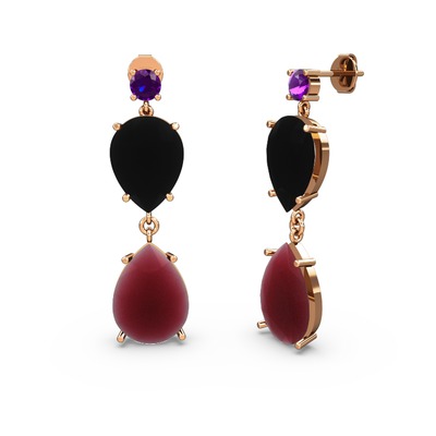 Ametist, kök yakut ve siyah zirkon 18 ayar rose altın küpe