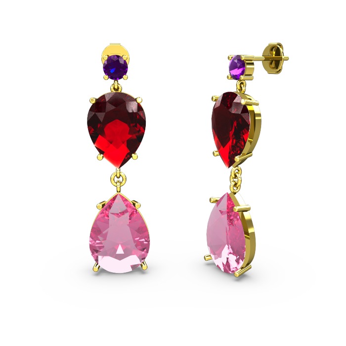 Ametist, pembe kuvars ve garnet 14 ayar altın küpe