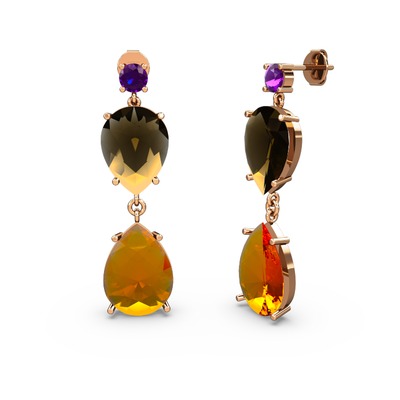 Ametist, sitrin ve dumanlı kuvars 14 ayar rose altın küpe