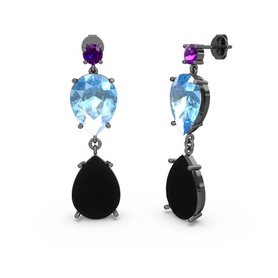 Ametist, siyah zirkon ve akuamarin 925 ayar siyah rodyum kaplama gümüş küpe