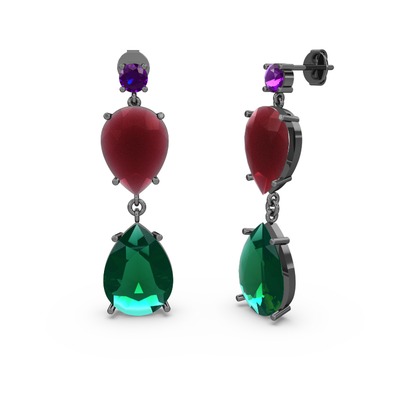 Ametist, yeşil kuvars ve kök yakut 925 ayar siyah rodyum kaplama gümüş küpe