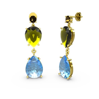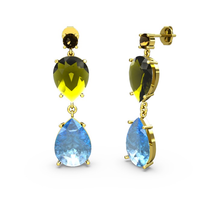 Dumanlı kuvars, akuamarin ve peridot 18 ayar altın küpe