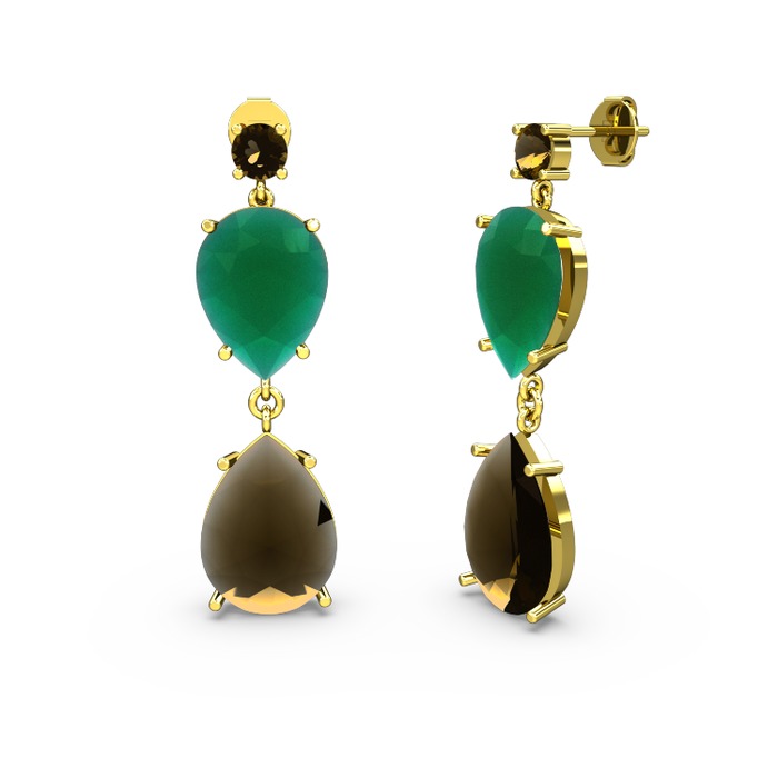 Dumanlı kuvars ve kök zümrüt 14 ayar altın küpe