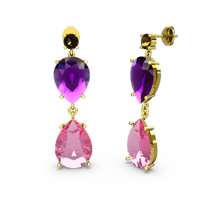 Dumanlı kuvars, pembe kuvars ve ametist 14 ayar altın küpe