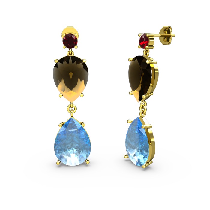 Garnet, akuamarin ve dumanlı kuvars 18 ayar altın küpe