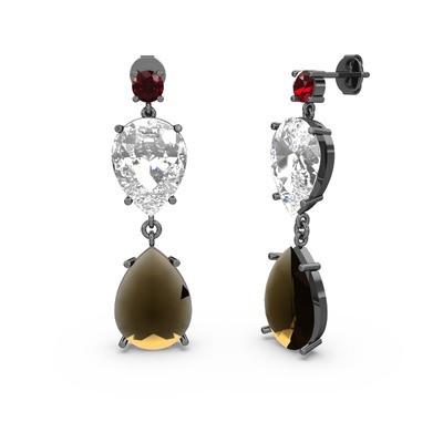 Garnet, dumanlı kuvars ve beyaz zirkon 925 ayar siyah rodyum kaplama gümüş küpe
