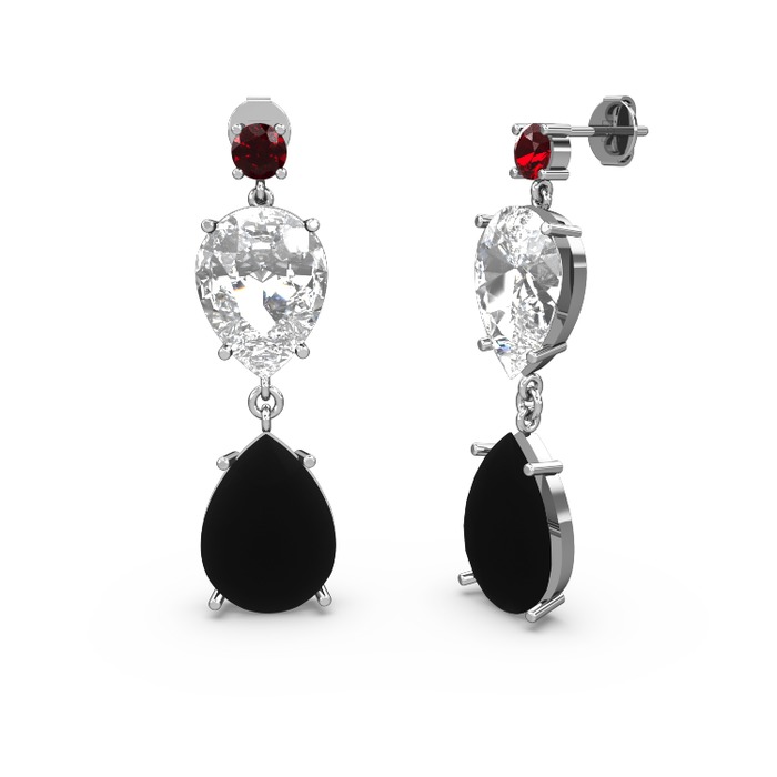 Garnet, siyah zirkon ve beyaz zirkon 8 ayar beyaz altın küpe