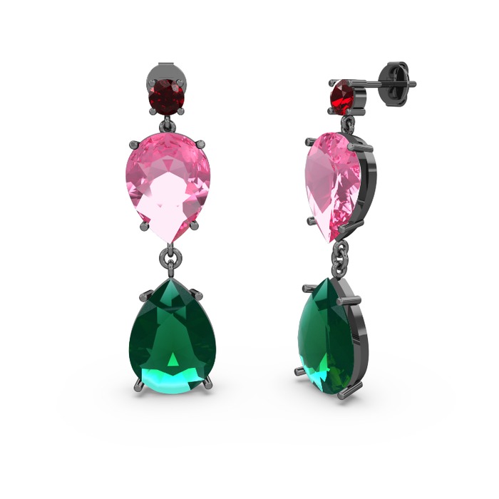 Garnet, yeşil kuvars ve pembe kuvars 925 ayar siyah rodyum kaplama gümüş küpe