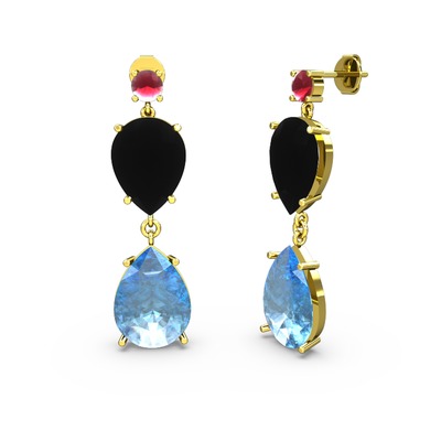 Kök yakut, akuamarin ve siyah zirkon 8 ayar altın küpe