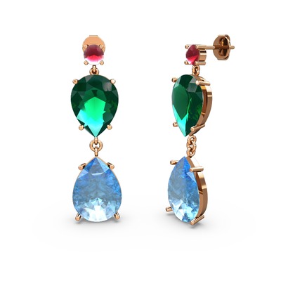 Kök yakut, akuamarin ve yeşil kuvars 8 ayar rose altın küpe