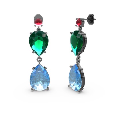 Kök yakut, akuamarin ve yeşil kuvars 925 ayar siyah rodyum kaplama gümüş küpe