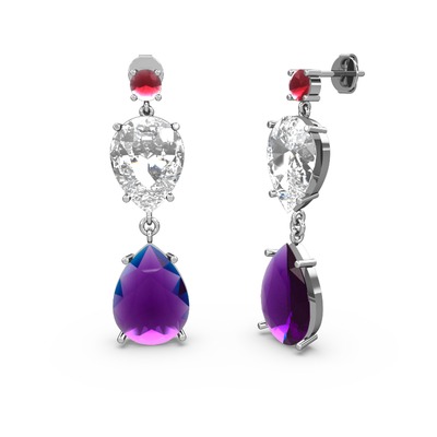 Kök yakut, ametist ve beyaz zirkon 18 ayar beyaz altın küpe