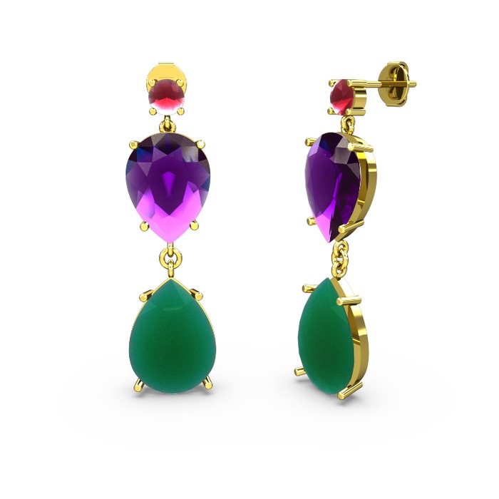 Kök yakut, kök zümrüt ve ametist 18 ayar altın küpe