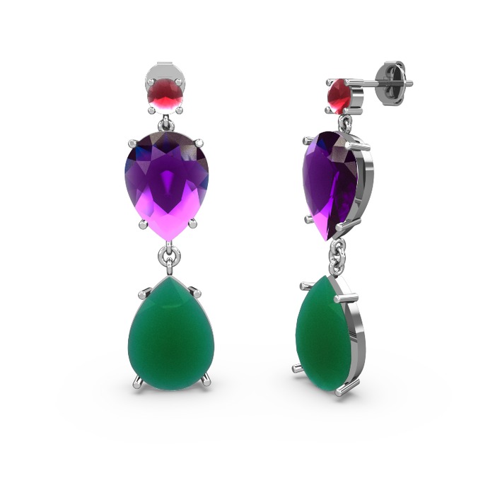 Kök yakut, kök zümrüt ve ametist 18 ayar beyaz altın küpe