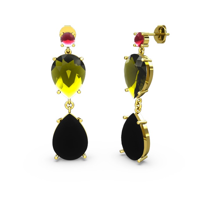 Kök yakut, siyah zirkon ve peridot 14 ayar altın küpe