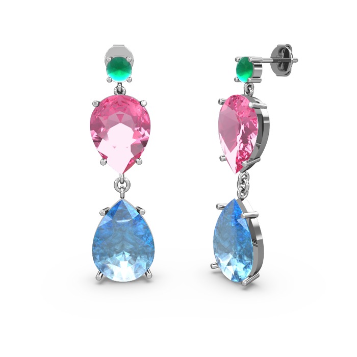 Kök zümrüt, akuamarin ve pembe kuvars 14 ayar beyaz altın küpe