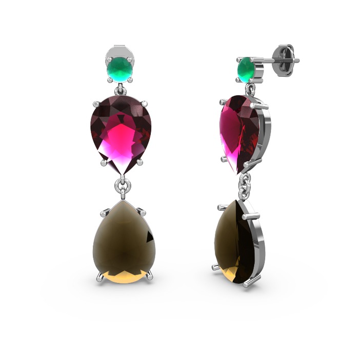Kök zümrüt, dumanlı kuvars ve rodolit garnet 14 ayar beyaz altın küpe