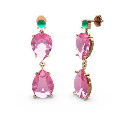 Kök zümrüt ve pembe kuvars 14 ayar rose altın küpe