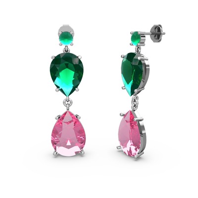 Kök zümrüt, pembe kuvars ve yeşil kuvars 8 ayar beyaz altın küpe