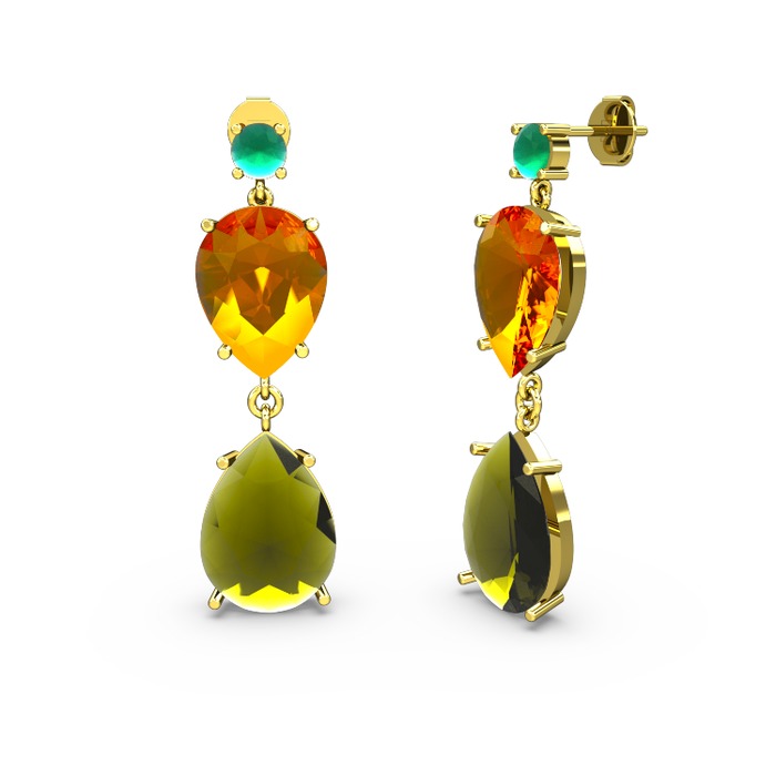 Kök zümrüt, peridot ve sitrin 18 ayar altın küpe