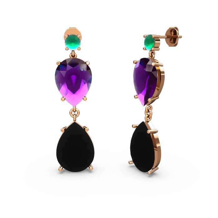 Kök zümrüt, siyah zirkon ve ametist 8 ayar rose altın küpe